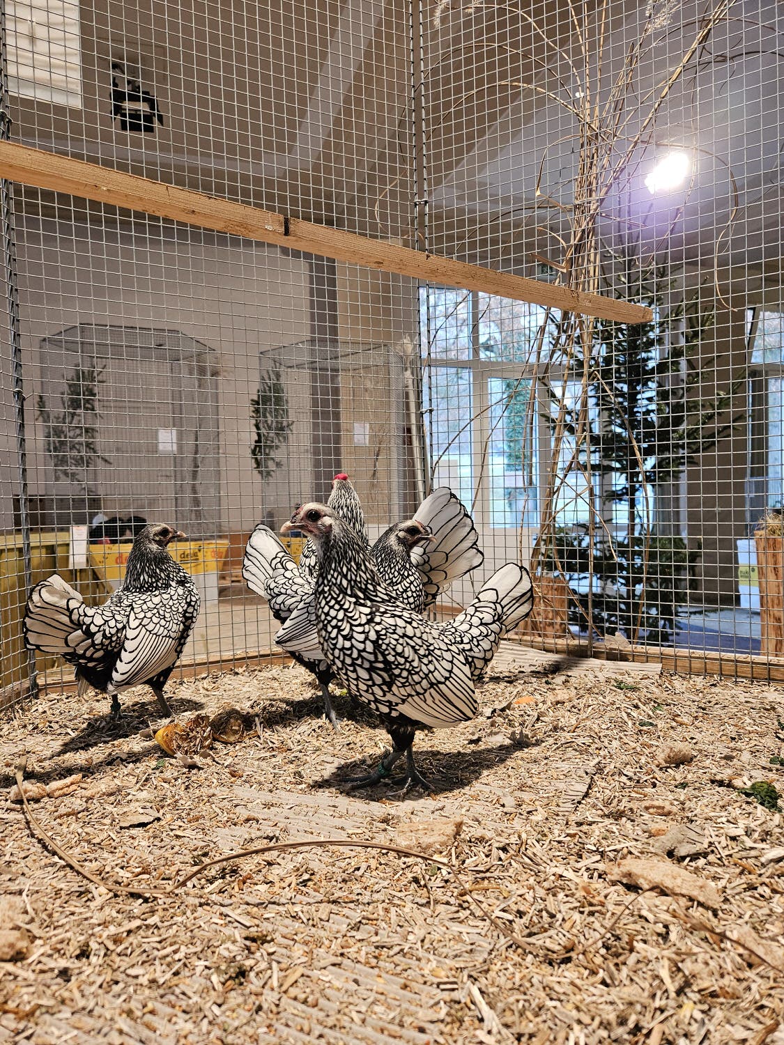 der Hühnerrasse Marans. Eine Rasse, die schokoladenfarbige Eier legt. Es handelt sich um ein kräftiges, robustes aber bewegliches Huhn mit vollem, breiten, aber nicht plumpen Körper mit leicht befiederten Läufen. Die meisten Tiere sind vom Farbschlag schwarz – kupfer, aber auch ein paar blau – kupfer befinden sich darunter.